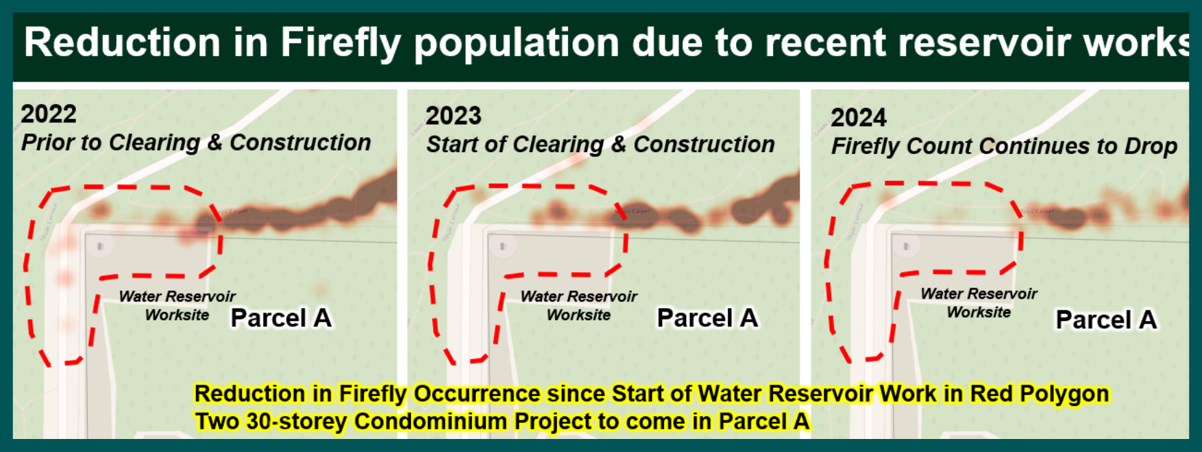 In a 5-year study conducted by FoBK on firefly population that live in Bukit Kiara, a worrying trend has emerged - there has been a significant reduction in the population of fireflies near a water reservoir constructed in 2023.