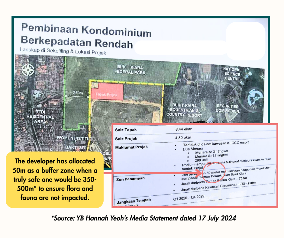 Due to the sensitive nature of fireflies, the development in Parcel A, located right next to their habitat, raises serious concerns about the future of this fragile population. While the developer has allocated a 50-metre buffer zone, conservation advocates have raised concerns that this may not be sufficient to mitigate the cumulative impacts of a large-scale, high-rise development on the fireflies and the surrounding flora and fauna of Bukit Kiara.